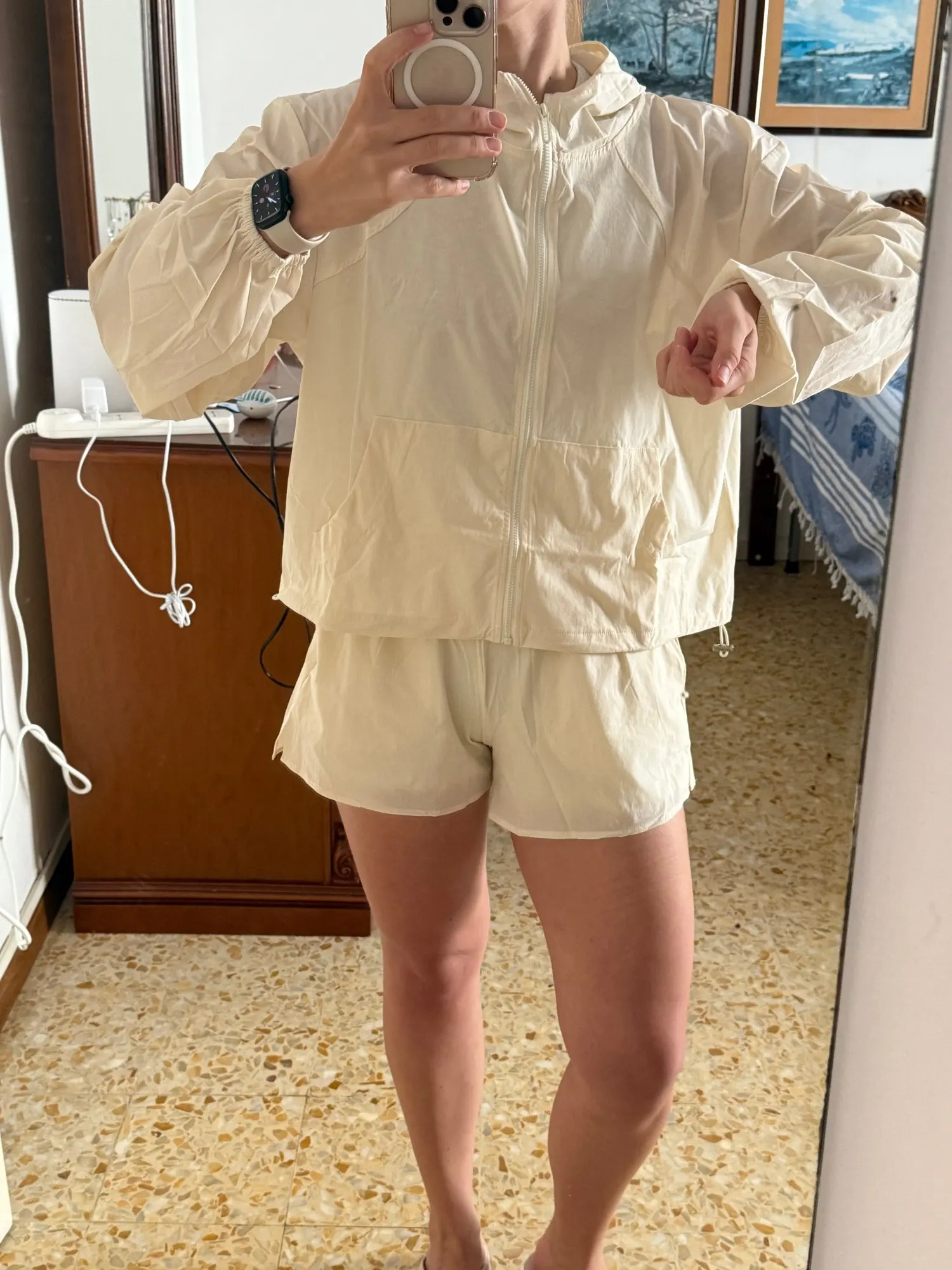 Very good material, the color is divine, it comes with adjustable drawstrings on the sides for a better fit. It should be noted that only the jacket arrives; the shorts are separate.